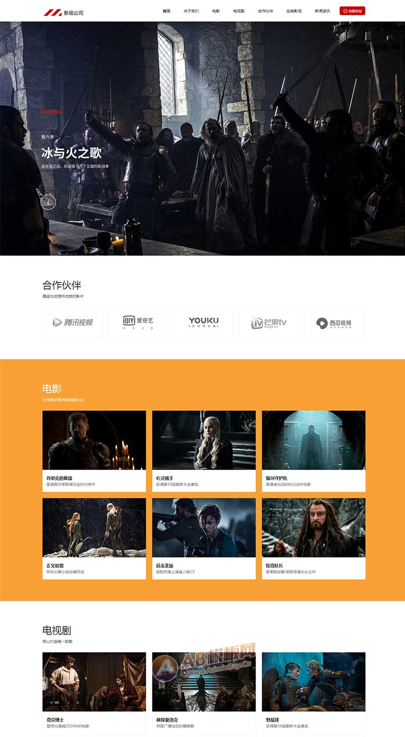 一款大气宽屏的影视行业静态网站模板,适合企业在线展示影视作品等业务。包括关于我们、公司简介、公司理念、电影、电视剧、合作伙伴、经典影视、新闻资讯等模块页面html下载。