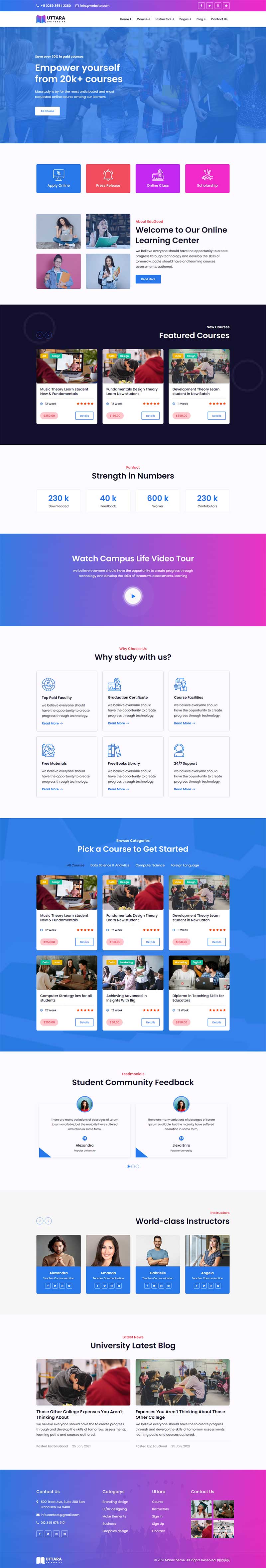 使用bootstrap4构建,响应式的大学学校,LMS和在线课程官网Html模板。它拥有所有必需的ui工具包。包含:2个主页演示和博客,博客单,课程,课程单页布局网站。