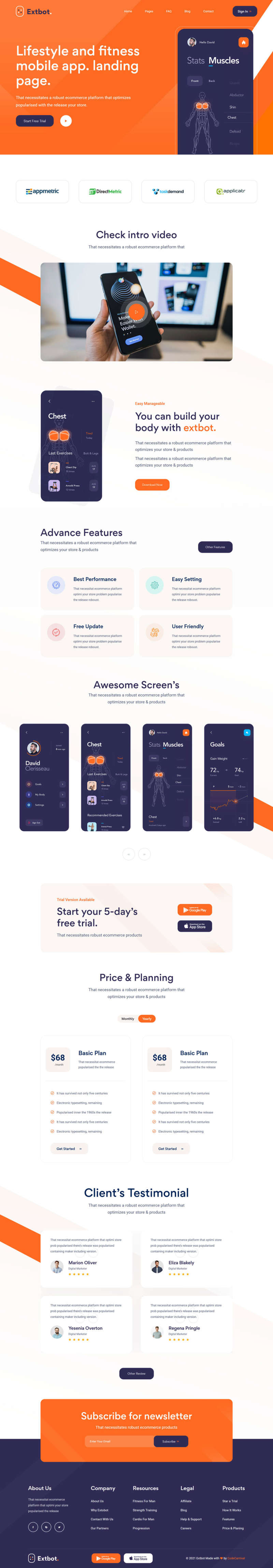 一款橙色系的运动健身app功能介绍,软件图文介绍响应式网页模板。适用于app软件内容介绍页面。