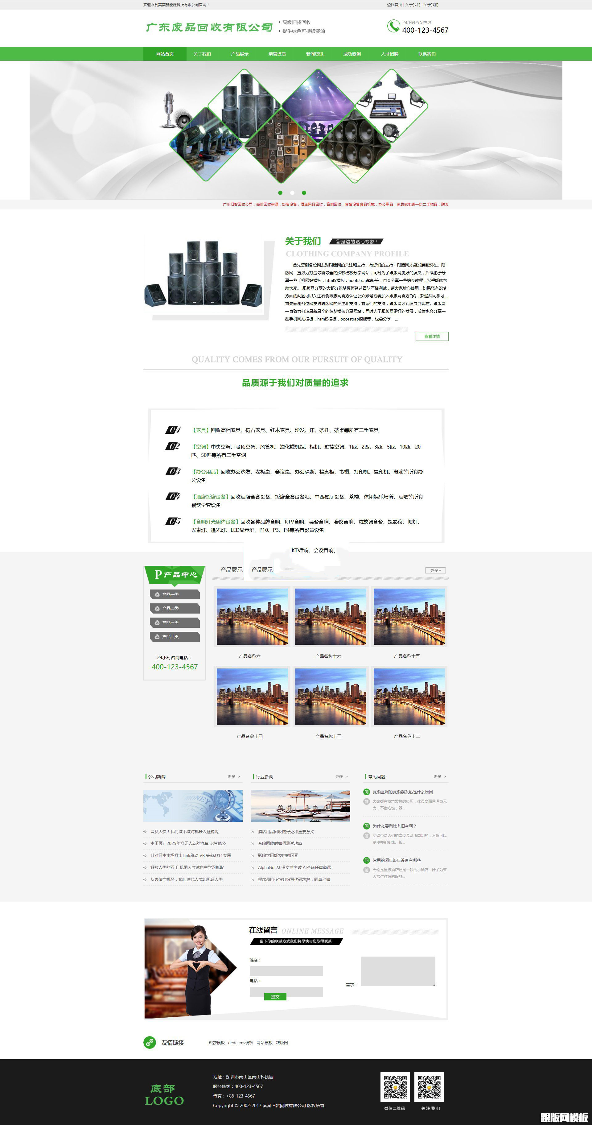 织梦最新内核开发的模板,该模板属于企业通用类、空调回收、音响回收、酒店设备回收、宾馆设备回收、冰箱冰柜回收、高档家具回收类企业都可使用,