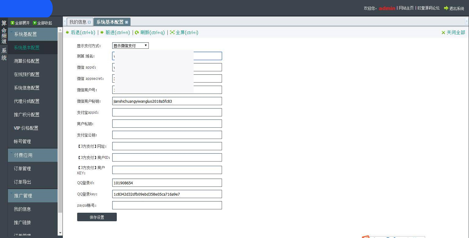 php 版本5.4 导入数据库和源码 配置数据库账号密码 config/inc_config.php 70行左右 后台:域名+/acs 账号:admin 密码:www.ohbbs.cn 后台域名绑定到目录acs 测算域名绑定到目录ffsm 页脚内容修改在网站后台修改! QQ互联 回调地址:http://域名/?ac=qqconnect