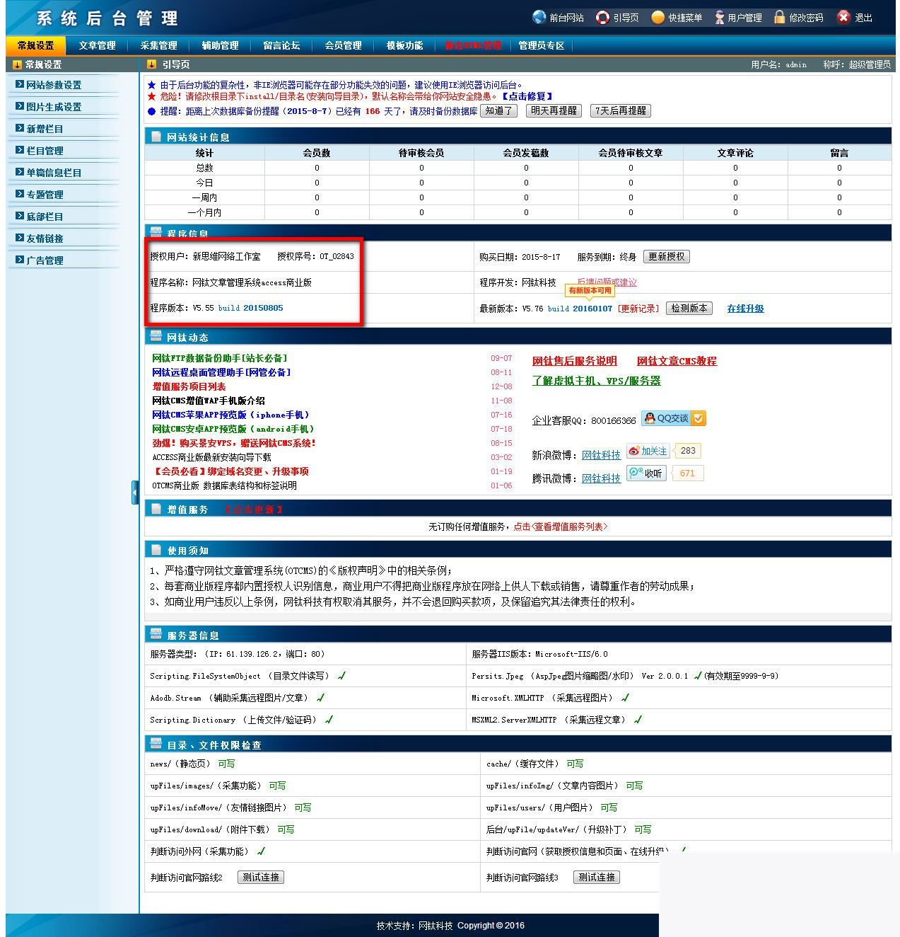 网钛文章管理系统(OTCMS)以简单、实用、傻瓜式操作而闻名,是国内 网钛文章管理系统(OTCMS)是最热门ASP开源网站管理系统之一,也是用户增长最快的ASP类CMS系统之一,目前的版本无论在功能,人性化,还是易用性方面,都有了长足的发展,OTCMS的主要目标用户锁定在草根型中小个人站长,让那些对网络不是很熟悉,对网站建设不是很懂又想做网站的人可以很快搭建起一个功能实用又强大,操作人性又易用。OTCMS更专注于个人网站或中小型门户的构建,当然也不乏有企业用户等在使用本系统,使用过OTCMS的用户都会它好评不断。