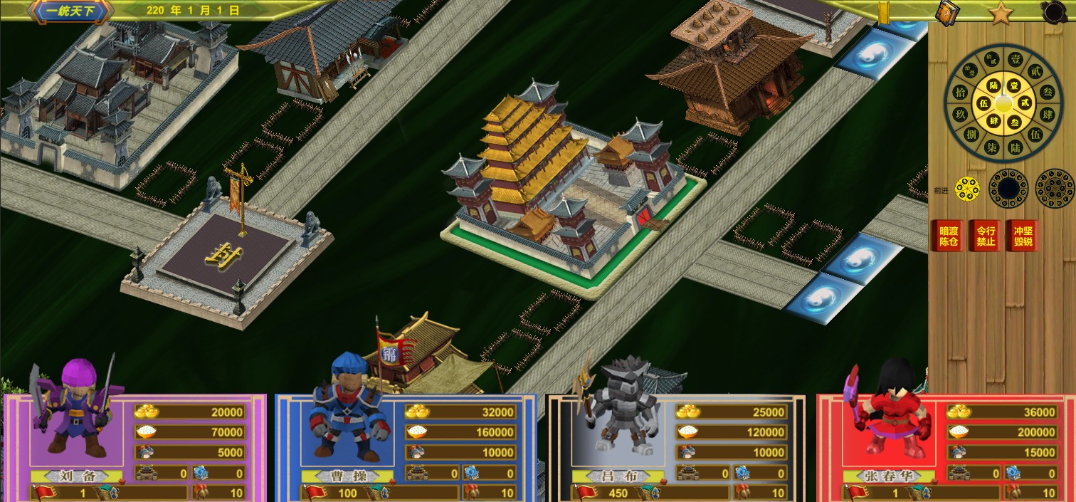 这是一款大富翁与三国结合的益智类游戏,胜者为王。玩家扮演某个君主与其他1至3位君主进行运气与智商上的较量,通过点击不同等级的转盘或者使用特定锦囊决定行动步数,走到城池、建筑、商铺、特殊地点等触发对应事件,最终达成地图目标或者击败所有君主者获胜。这里有策略上的尔虞我诈,有商战中的弱肉强食,有运气上的天命所在,有城池经营,有武将养成,有投奔背离;战场上,有猛将间的热血单挑,有名帅中的纵横驰骋,有谋士间的神鬼技能,有不同地形的武将能力,有攻城时的天气系统。游戏系统可以很复杂烧脑谋夺天下,也可以通过各种开关设定简化内容运气为王,还可以给电脑加强能力长久为战,不同的设定甚至可以使玩法大相径庭,趣味丛生。