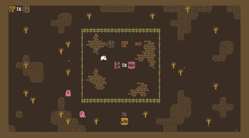 一款具有颠覆性创意的游戏,核心玩法就是——通过改变场景的规则来过关。 游戏的名字是 Baba Is You,这可不是什么让人占便宜的话。Baba 是游戏中游戏中主角的名字,之所以标题起得这么“愣”是因为这是游戏中的一条关键规则。 在第二关,谜题看上去似乎完全无解,因为旗子被墙围了起来,主角根本走过不去。不过四处乱转的时候,你会发现 wall 和 stop 这两个单词是可以移动的。当你破坏掉“wall is stop”这个句子时,关卡中的墙便不再具有阻挡的效果。