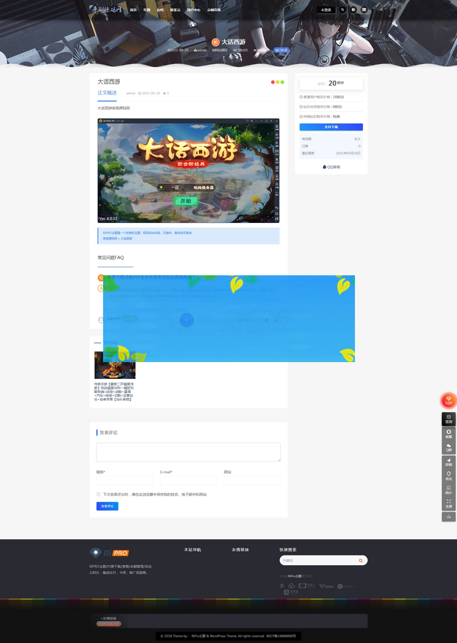 注意:使用该子主题前需要安装wordpress程序和ripro模板