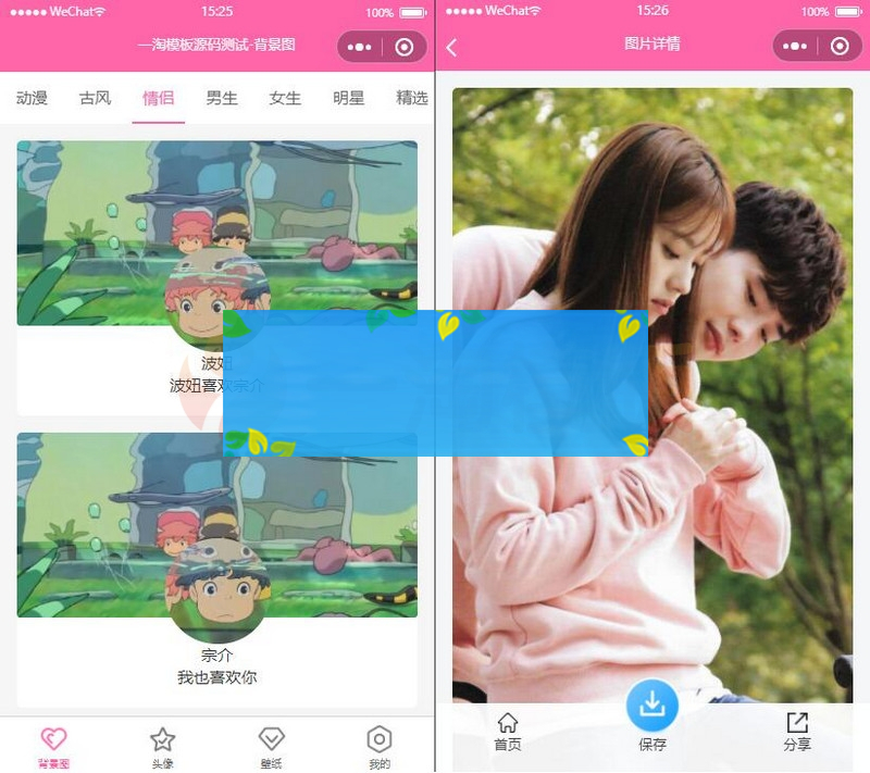 云开发版粉色UI微信小程序源码,背景图、头像、壁纸小程序源码,带流量主功能。